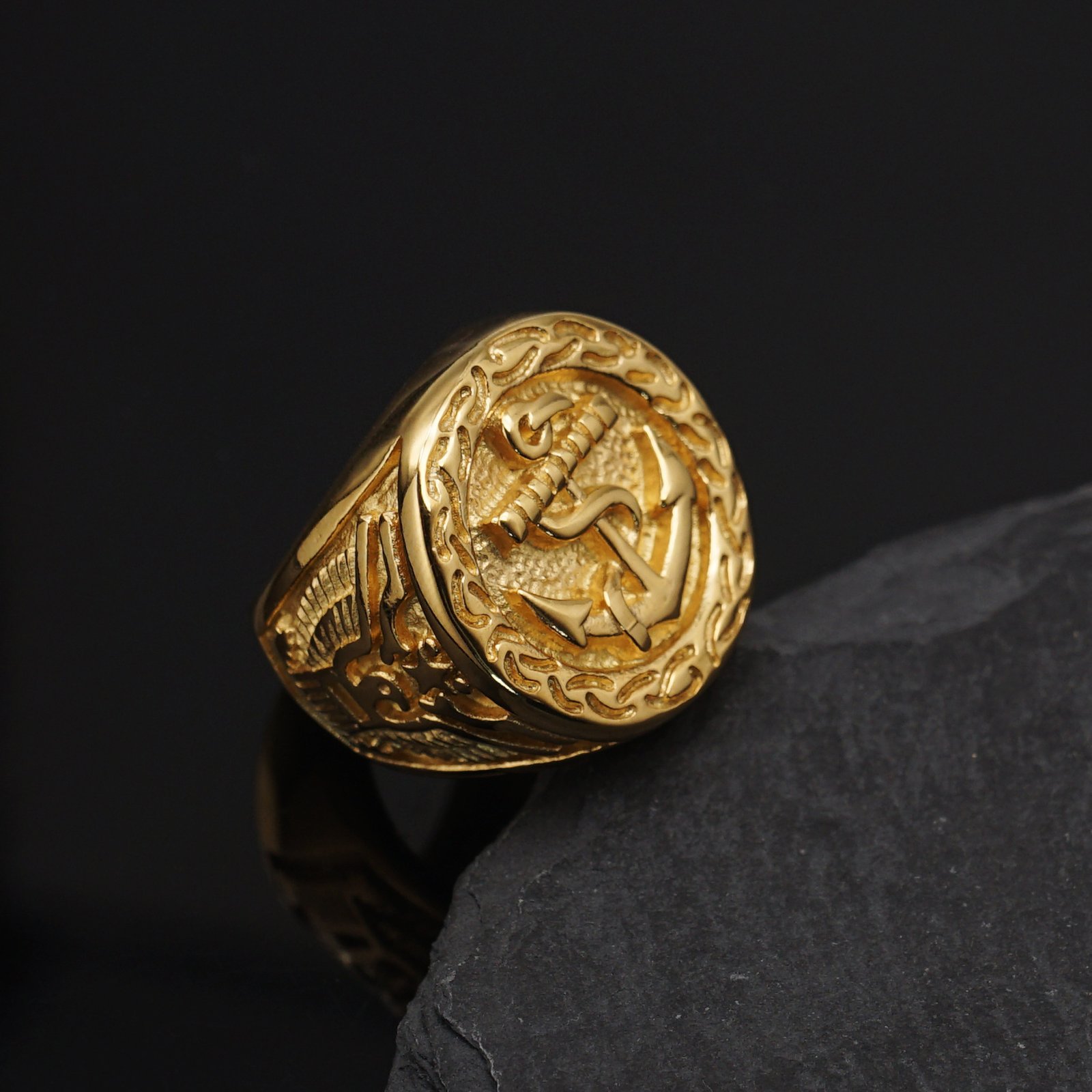 24-K Gold-Plated Retro Boat Anchor Design Signet Men’s Stainless Steel Waterproof Ring丨DZ1168G