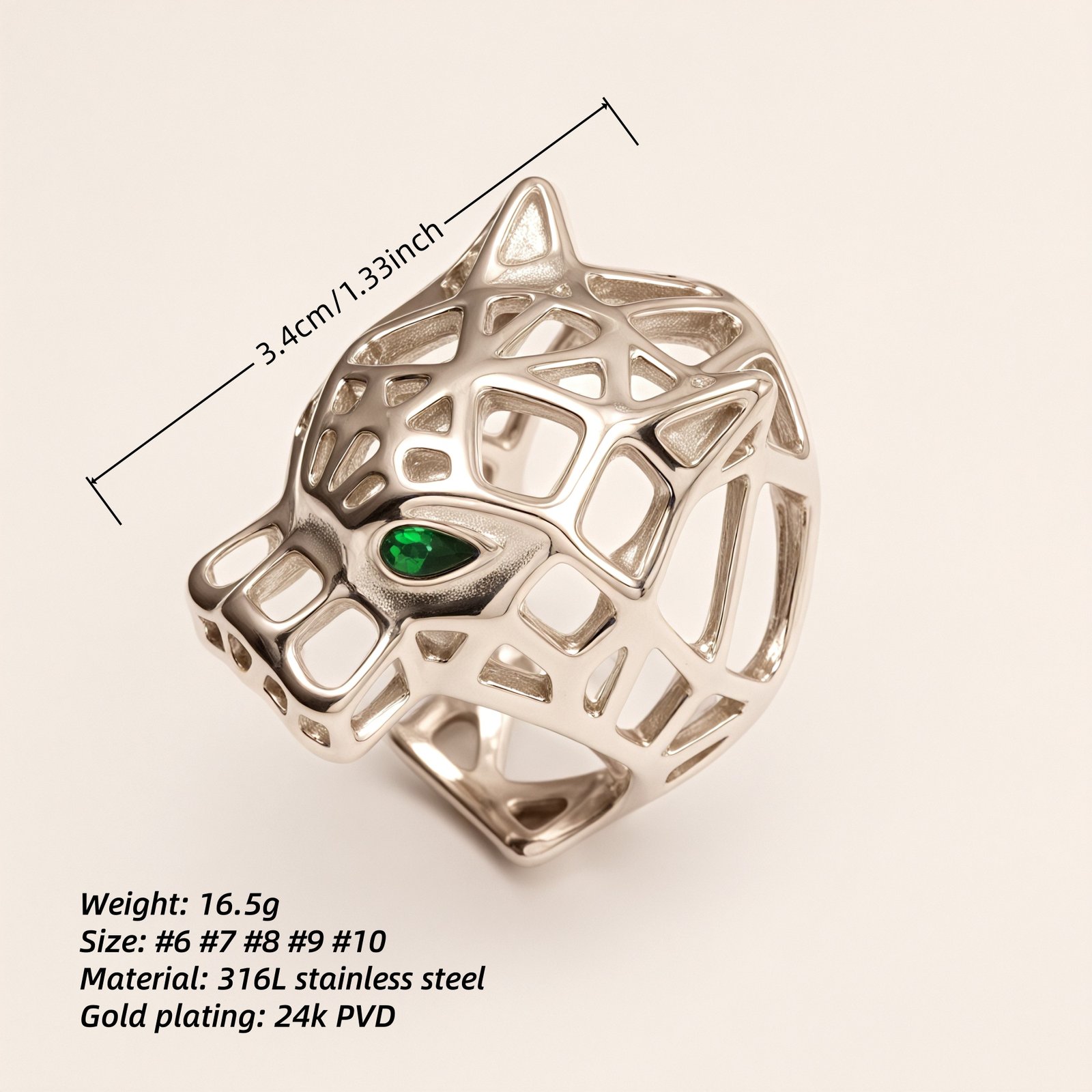 Stainless Steel Leopard Head Ring, Hollow with Green Eyes, Trendy Women’s Ring丨G001002JLV